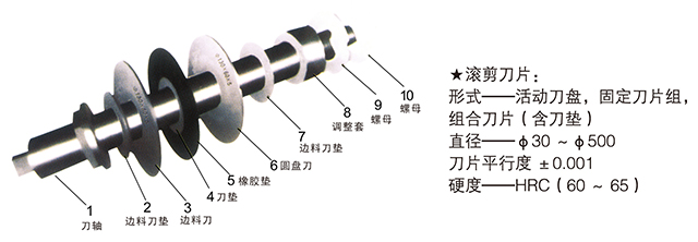 在圆刀方面,有把厚板、热轧盘管、酸洗盘管、电镀和着色钢板,或者硅钢板的两侧修剪的侧面修边机刀和根据用途的需要把钢板裁成一定宽度的纵切刀等。从对10mm的厚钢板进行修边用的直径500mm的大直径刀具到可以剪切0.1 mm左右的极薄钢板的直径1 00mm以下的小直径刀具,以及耐磨损性优异的超硬质合金制工具,各种刀具应有尽有,平面度达到微米级,能充分适应生产线的高速化,及被剪断材料的高抗拉强度等条件。